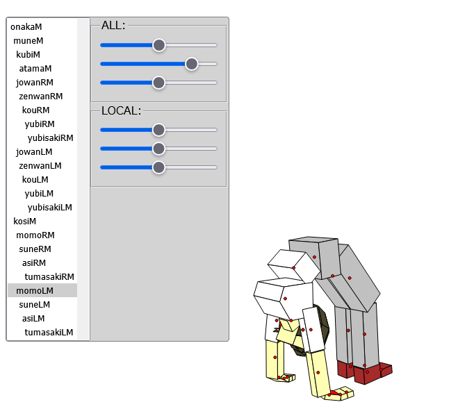 一部、面を赤く塗っているのは、モデルの向きを確認するためです。上腕の赤い面は「上腕二頭筋のある側」、手の甲が赤いのも同じ意味です。ほとんど直方体の組み合わせなので区別しづらいんですよね。