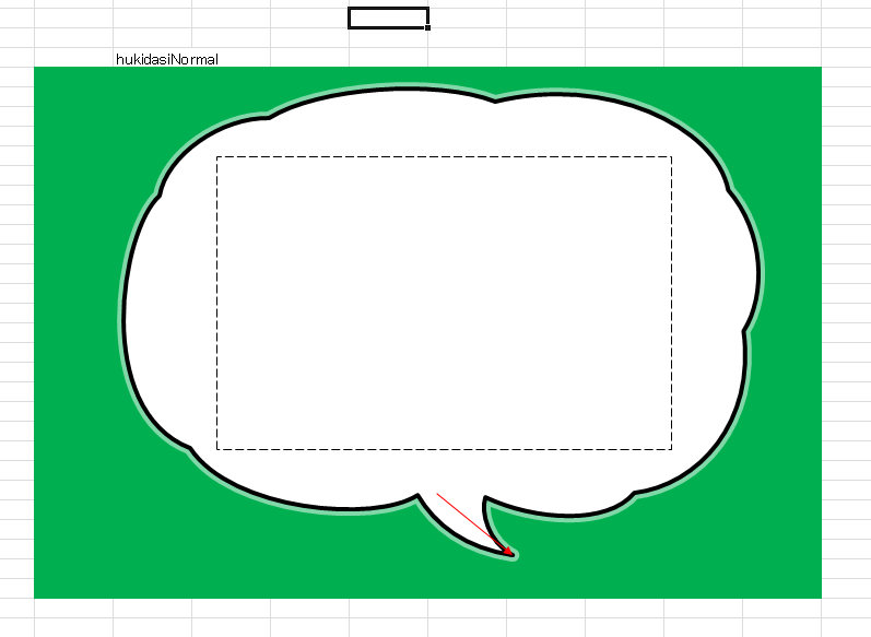 吹き出しのデータは Excel で作っていて、そのときに、点線の四角形は「HTML で文字を表示する部分」を示しており、