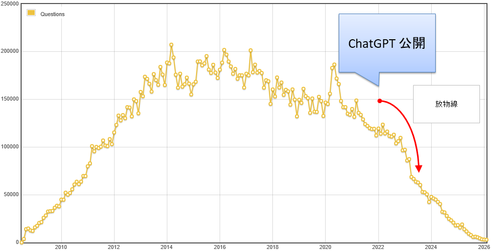 ピーク時には 20 万件の質問を受付けていましたが、2022 年 11 月に ChatGPT が公開され、放物線を描くような落ち方を見せて、その後は斜め 45 度の降下が続き、グラフ右端の 2026 年では言葉通り「雀の涙ほど」となっています。